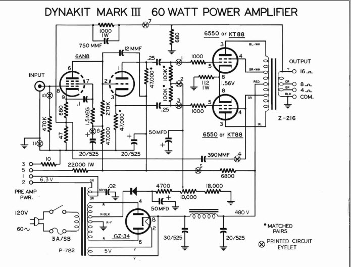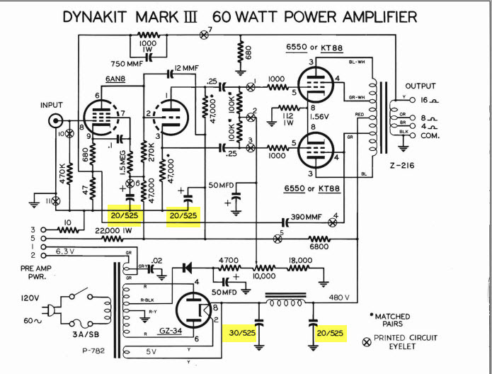 Amp này sản xuất vào thập niên 80, em nên thay hết giàn tụ lọc hoá (màu trắng, vỏ nhôm) bằng tụ đời mới nào em có thể kiếm được. Điện thế tụ phải trên 550V, nếu kg phải nối tiếp 2 con để nhân đôi điện thế. Tụ trên 500v khó kiếm lắm.