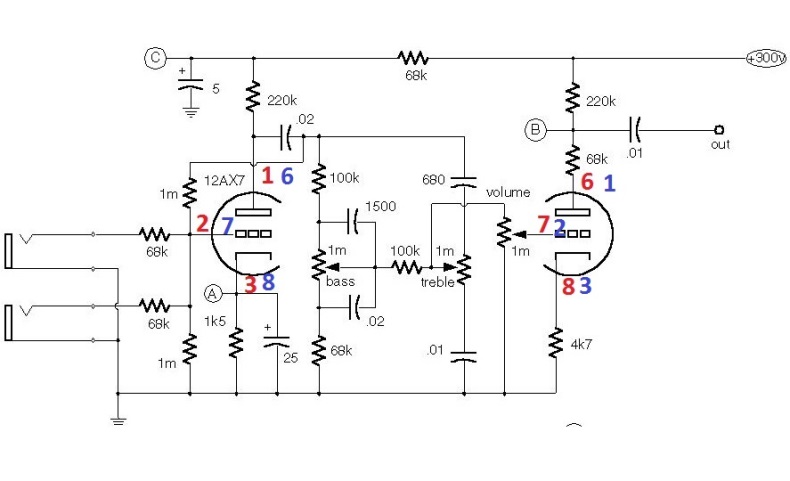 Sơ đồ chấm phết lại cho nó có màu mè tý. Ở đây sơ đồ là 2 nữa con 12AX. Tính vị chi một kênh là 1 bóng 12AX7. Nếu anh chọn cái nửa đầu tiên theo số màu đỏ (chân 1 : plate, chân 2 : Grid, chân 3 : Cathod) thì nửa còn lại chọn màu đỏ luôn (tương ứng chân 6 :plate, chân 7 : Grid, chân 8 : Cathod)