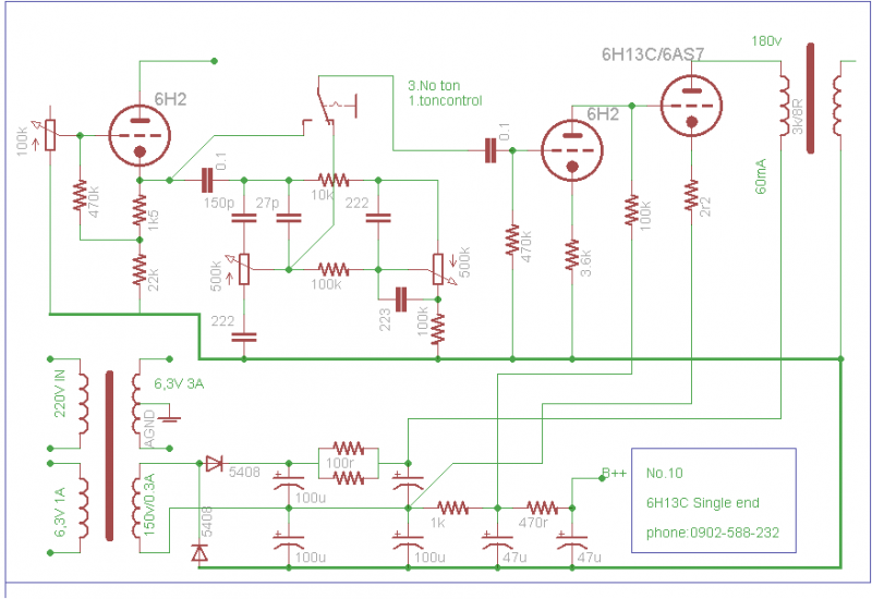 -Sử dụng bóng triode 6h13c và 6h2 ngon rẻ , dễ thay thế.chỉ cần 1 cây 6h13c và 2 cây 6h2 là đủ cho 2 kênh.