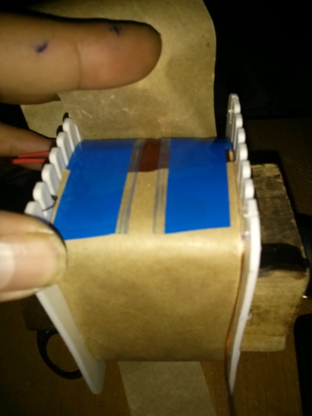Tiếp theo cắt băng keo, nhiều khúc ngắn ngắn, để khi quấn giấy lót là bóc một khúc băng keo dán lại khỏi bung, Hay trong lúc quấn dây, trong người ngứa ngáy cần gãi ngay, nhiều lúc ngứa chỗ hiểm hóc, thò hai tay gãi, thì chụp miếng băng keo ịn vô cho dính dây lại rồi gãi thoải mái, gãy đã rồi, tháo băng keo ra quấn tiếp