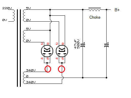 Chào Bác Phúc, lâu không thấy Bác post bài mới, mỗi em độc thoại trên này buồn quá Bác ơi. Em đang làm phần nguồn, mới kiếm được 2 quả 5U3C (5U4G) hàng lưu kho chưa sài, định nối song song 2 đèn lại cho dòng cấp được cao mà phân vân không biết đấu nối như hình dưới đúng không Bác?